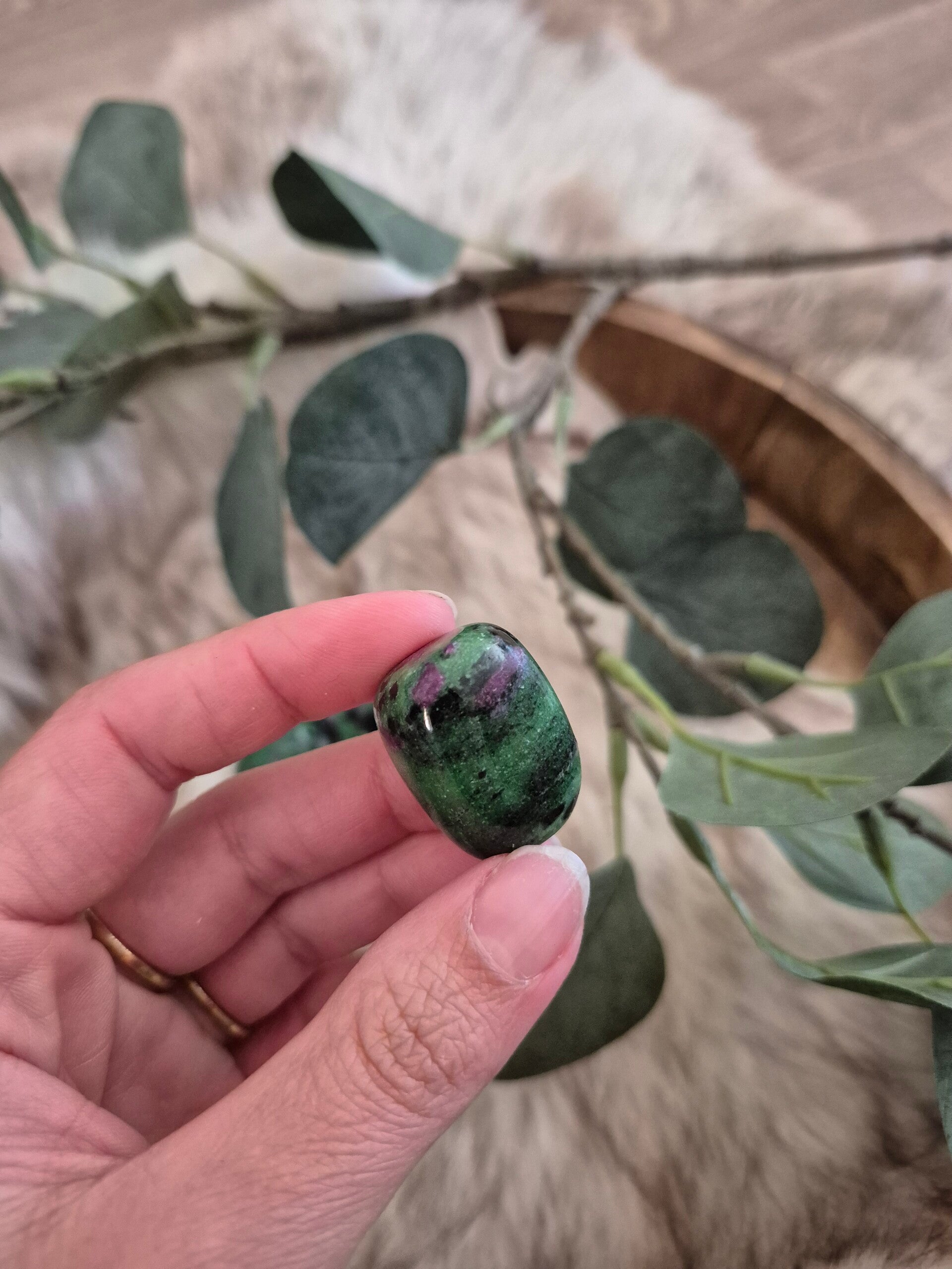 Dit is een combinatie van 2 hele verschillende stenen. Robijn met de energie van vuur, passie en levenskracht, terwijl de groene zoisiet juist de energie draagt van groei, heling, ontwikkeling en verzachting.